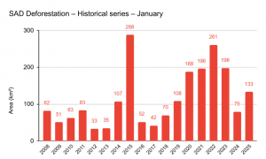 Deforestation in the Legal Amazon increased by 68% in January 2025 compared to the same period last year, reaching 133 km² of forest destruction. This is the sixth largest deforested area in the historical series for the month and represents more than 400 soccer fields devastated per day. “These figures show growing pressure on the Amazon and serve as a warning sign of the need to strengthen monitoring efforts in the region. In order to reverse this scenario, it is essential to intensify inspection, expand operations to combat environmental crimes and promote policies that encourage the protection and sustainable use of the forest”, says Imazon researcher, Larissa Amorim. The data is from Imazon’s Deforestation Alert System (SAD) and shows that Mato Grosso led the devastation in January this year, concentrating 45% of the total detected. Roraima (23%) and Pará (20%) follow, and together they account for 88% of the reduction in vegetation recorded in the Amazon. As for the municipalities, six of the ten with the most deforestation are in Mato Grosso, two in Roraima and one in Pará.