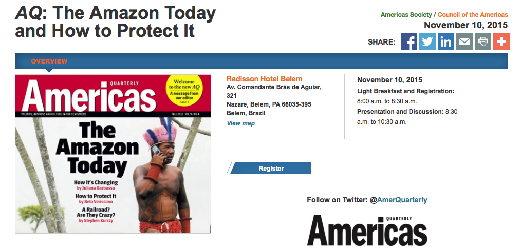 Acontece nessa terça-feira, dia 10 de novembro, o debate Amazônia Desmatamento Zero que contará com a participação de Simão Jatene (Governador do Pará), Bruno Valente (Procurador do Ministério Público Federal), Beto Veríssimo (Pesquisador Sênior e co-fundador do Imazon) e Brian Winter (Editor-chefe da revista Americas Quarterly e Vice-Presidente da Americas Society). Na solenidade, promovida pela Americas Society, também acontecerá o lançamento da edição trimestral da revista Americas Quartely que possui circulação em toda a América Latina e traz na capa a chamada “Today’s Amazon: How It’s Changing and How to Protect It.” Serviço Debate sobre desmatamento zero Radisson Hotel Belém (Av. Comandante Brás de Aguiar, 321. Nazaré, Belém-PA) Horário: 8h às 10h30 Inscrições gratuitas no site.