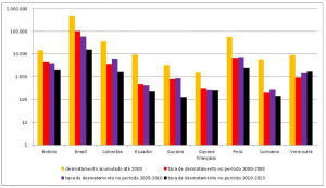 Deforestation in the Amazon (1970-2013) is the title of this study, which analyzes historic and recent deforestation trends in all the countries of the Amazon region. The cumulative deforestation up to 2013 corresponds to 13.3% of the original forest cover of the Amazon, according to this analysis. The largest loss of original forest cover (9.7%) took place between 1970 and 2000, and the remaining 3.6% loss happened between 2000 and 2013. The deceleration of deforestation in the thirteen years elapsed between 2000 and 2013 is clearly correlated in Brazil, Bolivia and Ecuador, while Colombia, Peru, Suriname, French Guiana and Guiana either experienced surges in intervening periods or showed evidence of stabilization. The only country that displays the opposite tendency is Venezuela, with evidence of acceleration of forest loss.