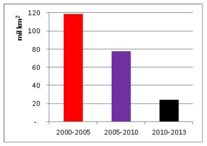 • In the Brazilian Amazon the rate of deforestation decreased starting 2006. However, in the 2000 - 2013 period 174,000 km 2 of forest were lost, or 5% of the original forest cover. This loss is mainly associated with agriculture and cattle ranching (p. 16).