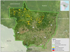 Distribuição espacial da exploração madeireira autorizada e não autorizada no Estado de Mato Grosso entre agosto/2011 e julho/2012.