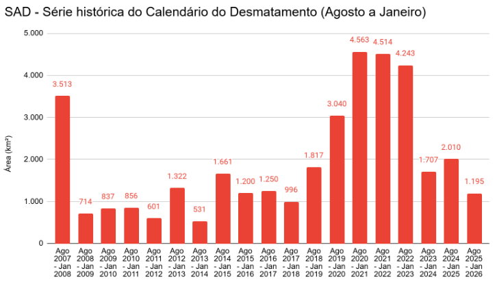 Apenas em janeiro, o desmatamento caiu de 133 km² em 2025 para 83 km² em 2026, redução que representa uma área equivalente a 5 mil campos de futebol. Com isso, nos últimos seis meses, entre agosto de 2025 e janeiro de 2026, o desmatamento acumulado fechou em 1.195 km². Essa área é 41% menor do que no período anterior, entre agosto de 2024 e janeiro de 2025, quando foram desmatados 2.010 km².