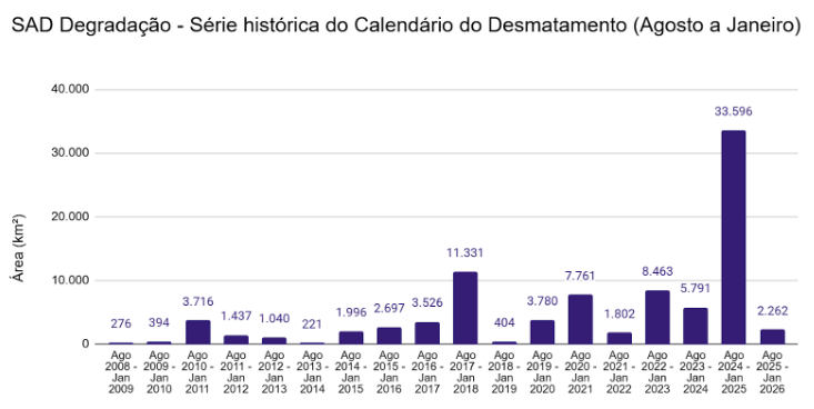 Outra notícia positiva é a queda na degradação florestal, dano causado pelo fogo e pela extração madeireira. Em janeiro, a área degradada na Amazônia chegou a 28 km², 92% a menos do que no mesmo mês do ano anterior. Com isso, a degradação acumulada desde agosto de 2025 fechou em 2.262 km², uma queda de 93% em comparação com o período anterior, entre agosto de 2024 e janeiro de 2025. “Isso ocorreu porque tivemos um recorde histórico de degradação no final de 2024, devido ao aumento dos incêndios florestais, que são muito favorecidos pela seca”, relembra Manoela.
