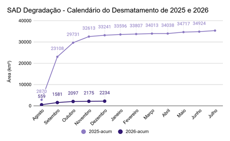 Apesar do mês de dezembro ter registrado alta de 7% na derrubada em toda a Amazônia, pois passou de 85 km² em 2024 para 91 km² em 2025, o acumulado desde janeiro fechou com redução de 27%. Isso porque a devastação passou de 3.739 km² de janeiro a dezembro de 2024 para 2.741 km² no mesmo período de 2025. Este foi o terceiro ano consecutivo com queda do desmatamento na região.