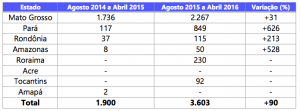 Tabela 1. Evolução do desmatamento entre os Estados da Amazônia Legal de agosto de 2014 a abril de 2015 e agosto de 2015 a abril de 2016 (Fonte: Imazon/SAD).