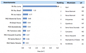 O SAD registrou 10 quilômetros quadrados de desmatamento nos Assentamentos de Reforma Agrária em abril de 2016 (Figura 5). Os Assentamentos mais afetados pelo desmatamento foram PA Rio Juma (Apuí; Amazonas), PA Pau Brasil (Nova Mamoré; Rondônia) e PA Ivo Inácio (Nova Mamoré; Rondônia).