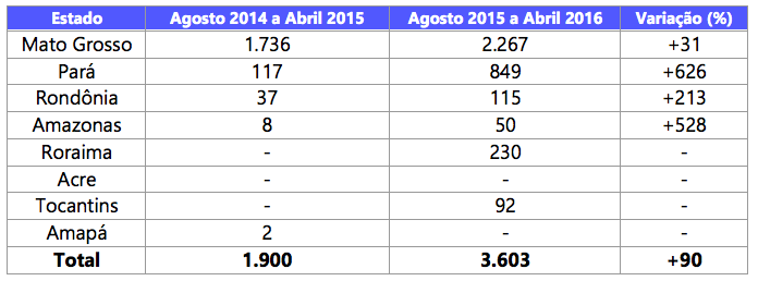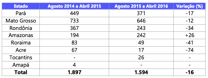Considerando os nove primeiros meses do calendário atual de desmatamento (agosto de 2015 a abril de 2016), o Mato Grosso lidera o ranking com 41% do total desmatado no período. Em seguida aparece Pará (23%), Amazonas (15%) e Rondônia (15%). Em termos relativos, houve redução de 74% no Acre e 41% em Roraima.