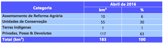 De acordo com o SAD, o desmatamento (supressão total da floresta para outros usos alternativos do solo) atingiu 183 quilômetros quadrados em abril de 2016 (Figura 1 e Figura 2).