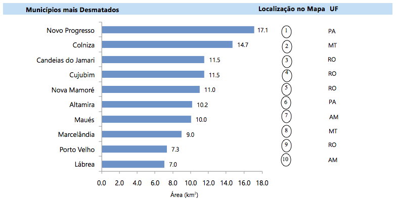 Em abril de 2016, os municípios mais desmatados foram: Novo Progresso (Pará) e Colniza (Mato Grosso) (Figura 7 e 8).