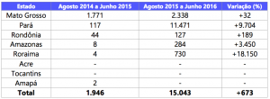 Em junho de 2016, o SAD registrou 9.481 quilômetros quadrados de florestas degradadas (florestas intensamente exploradas pela atividade madeireira e/ou queimadas) (Figuras 2 e 4). Desse total, a grande maioria (93%) ocorreu no Pará, seguido por Roraima (4%), Amazonas (2%) e Rondônia (1%). Figura 4. Degradação Florestal de agosto de 2014 a junho de 2016 na Amazônia Legal (Fonte: Imazon/SAD). Tabela 2. Evolução da degradação florestal entre os Estados da Amazônia Legal de agosto de 2014 a junho de 2015 e agosto de 2015 a junho de 2016 (Fonte: Imazon/SAD). *Os dados do Maranhão não foram analisados.
