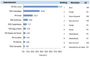O SAD registrou 223 quilômetros quadrados de desmatamento nos Assentamentos de Reforma Agrária em junho de 2016 (Figura 5). Os Assentamentos mais afetados pelo desmatamento foram PA Rio Juma (Apuí; Amazonas), PDS Liberdade (Pacajá; Pará) e PA Acari (Novo Aripuanã; Amazonas). Figura 5. Assentamentos de Reforma Agrária mais desmatados em junho de 2016 na Amazônia Legal (Fonte: Imazon/SAD).