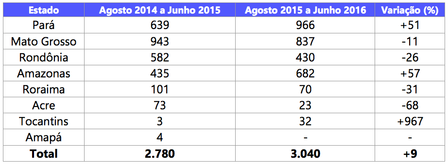 De acordo com o SAD, o desmatamento (supressão total da floresta para outros usos alternativos do solo) atingiu 972 quilômetros quadrados em junho de 2016 (Figura 1 e Figura 2). Figura 1. Desmatamento de agosto de 2014 a junho de 2016 na Amazônia Legal (Fonte: Imazon/SAD). Figura 2. Desmatamento e Degradação Florestal em junho de 2016 na Amazônia Legal (Fonte: Imazon/ SAD). Em junho de 2016, o desmatamento concentrou no Pará (50%), Amazonas (27%), Mato Grosso (12%) e Rondônia (9%), com menor ocorrência em Roraima (1%) e Acre (1%) (Figura 3). O desmatamento acumulado no período de agosto de 2015 a junho de 2016, correspondendo aos onze primeiros meses do calendário oficial de medição do desmatamento, atingiu 3.040 quilômetros quadrados. Houve aumento de 9% do desmatamento em relação ao período anterior (agosto de 2014 a junho de 2015) quando atingiu 2.780 quilômetros quadrados. Figura 3. Percentual do desmatamento nos Estados da Amazônia Legal em junho de 2016 (Fonte: Imazon/SAD). Considerando os onze primeiros meses do calendário atual de desmatamento (agosto de 2015 a junho de 2016), o Pará lidera o ranking com 32% do total desmatado no período. Em seguida aparece Mato Grosso (28%) e Amazonas (22%). Em termos relativos, houve redução de 68% no Acre e 31% em Roraima. Em termos absolutos, o Pará lidera o ranking do desmatamento acumulado com 966 quilômetros quadrados, seguido pelo Mato Grosso (837 quilômetros quadrados) e Amazonas (682 quilômetros quadrados) (Tabela 1). Tabela 1. Evolução do desmatamento entre os Estados da Amazônia Legal de agosto de 2014 a junho de 2015 e agosto de 2015 a junho de 2016 (Fonte: Imazon/SAD). *Os dados do Maranhão não foram analisados.