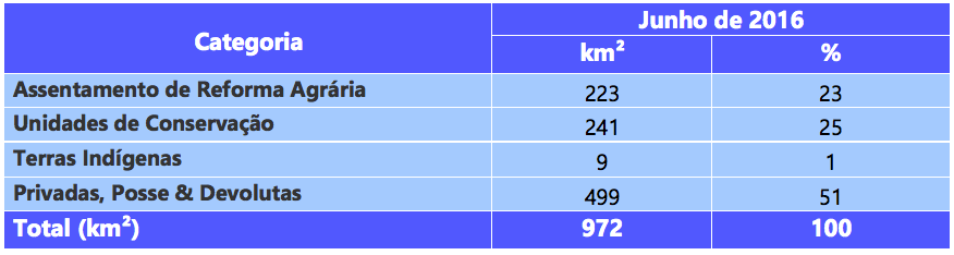 Em junho de 2016, a maioria (51%) do desmatamento ocorreu em áreas privadas ou sob diversos estágios de posse. O restante do desmatamento foi registrado em Unidades de Conservação (25%), Assentamentos de Reforma Agrária (23%) e Terras Indígenas (1%) (Tabela 3). Tabela 3. Desmatamento por categoria fundiária em junho de 2016 na Amazônia Legal (Fonte: Imazon/ SAD).