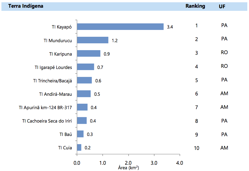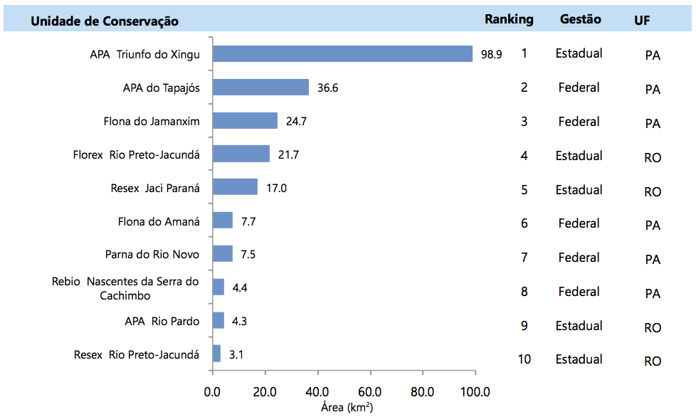 No mês de junho de 2016, o SAD detectou 241 quilômetros quadrados de desmatamento nas Unidades de Conservação (Figura 6). No caso das Terras Indígenas, em junho de 2016 foram detectados 9 quilômetros quadrados de desmatamento (Figura 7). Figura 6. Unidades de Conservação mais desmatadas na Amazônia Legal em junho de 2016 (Fonte: Imazon /SAD). Figura 7. Terras Indígenas desmatadas na Amazônia Legal em junho de 2016 (Fonte: Imazon /SAD).