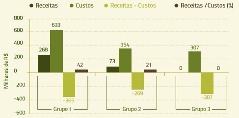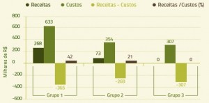Figura 6. Estimativas de receitas e custos em 2013 e relação receita/custo para o grupo 3.