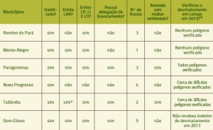 Ulianópolis, por sua vez, ainda estava em processo de habilitação quando fizemos a última atualização. Já Novo Progresso não possuía arrecadação própria, mas seu gestor ambiental afirmou estar finalizando o Documento de Arrecadação Municipal (DAM) para taxas e autuações ambientais, que deve ser publicado ao longo de 2014. Finalmente, Rondon do Pará está habilitado desde 2011 e, segundo o entrevistado, emite licenças, mas os valores de arrecadação de 2013 não foram fornecidos.