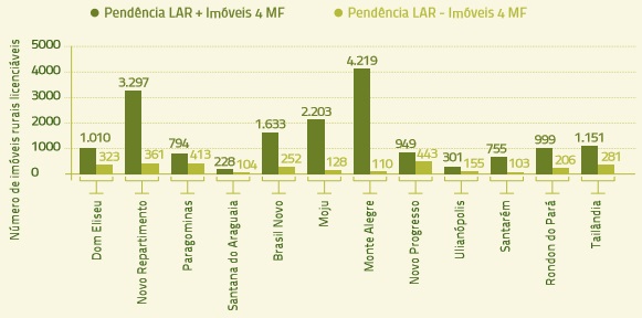 - Os prazos para o requerimento da LAR por parte dos produtores rurais previstos nos termos de compromissos firmados entre municípios e Ministério Público Federal (MPF) são: i) propriedades acima de 500 hectares até três mil hectares – até a data de 30/11/2014 e ii) propriedades de até 500 hectares – até a data de 31/05/2015. O prazo para a emissão de todas as LARs adotado pelo estudo, baseado nos termos firmados, é junho de 2016.