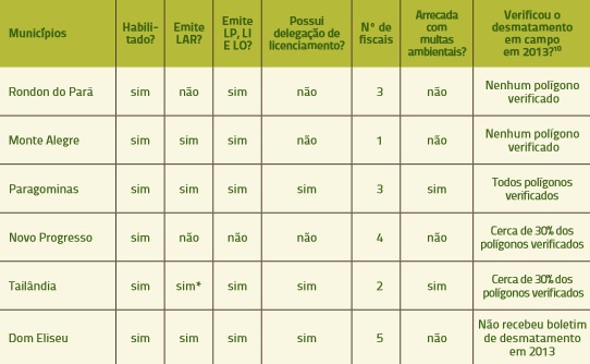 Quanto à fiscalização e monitoramento, todos os gestores alegaram deter ao menos um fiscal legalmente habilitado, porém afirmaram que a falta de corpo técnico e de infraestrutura e a dificuldade de acesso às áreas desmatadas dificultaram ou inviabilizaram as operações de fiscalização. Segundo relatório disponibilizado pelo PMV, Brasil Novo e Paragominas verificaram 100% dos polígonos identificados em 2013. Novo Repartimento conseguiu visitar mais de 86% dos polígonos, enquanto Novo Progresso e Tailândia verificaram apenas 33%. Rondon do Pará, Monte Alegre e Moju não fizeram a verificação do desmatamento em campo nesse ano. Os outros municípios (Santarém, Santana do Araguaia, Dom Eliseu e Ulianópolis) não receberam boletins de alertas de desmatamento do PMV durante 2013[8].
