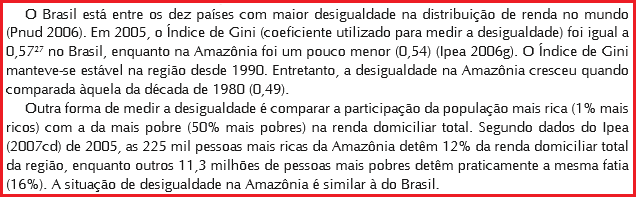 O IDH é usado para medir a qualidade de vida da população por meio da análise da renda, da longevidade e da educação. Cada variável do IDH (renda, longevidade e educação) é expressa por um índice que varia de zero (pior) até um (melhor). O IDH total é a média desses índices. Regiões com baixo índice de desenvolvimento humano apresentam IDH inferior a 0,500, enquanto as regiões com índice médio de desenvolvimento humano têm IDH entre 0,500 e 0,799. Por sua vez, as regiões com alto índice de desenvolvimento humano apresentam IDH acima de 0,800. Embora o IDH seja útil para entender a situação de uma região ou país, ele pode ocultar desigualdades severas e subestimar o bem-estar da população (que vai além desses indicadores). Em 2005, o Brasil ocupava a 63ª posição no ranking mundial do IDH (0,790), o qual reúne 177 países e territórios (Pnud 2005). Em 2006, a posição do Brasil caiu (69ª), mas seu IDH aumentou (0,792) (Pnud 2006). O IDH das nações é calculado e publicado pela ONU anualmente, enquanto o dos municípios e Estados brasileiros tem sido apresentados decenalmente. Nesta seção, apresentaremos a evolução do IDH na Amazônia.[36] LIGEIRO AUMENTO DO IDH NA AMAZÔNIA Na Amazônia também houve aumento no IDH: de 0,624, em 1991, para 0,705 em 2000. Apesar disso, o IDH da Amazônia em 2000 é ainda inferior à média brasileira daquele ano (0,766) e ao das outras regiões do país, com exceção do Nordeste (IDH 0,681). Em comparação com os países da Bacia Amazônia naquele ano, a Amazônia brasileira apresenta IDH superior apenas ao da Bolívia (0,648) e ao da Guiana (0,704) (Pnud 2001). Em 2000, o Mato Grosso teve o melhor IDH da Amazônia (0,773) –um pouco acima da média nacional– ocupando a nona colocação entre os 27 Estados do País. Por outro lado, a região abriga o pior IDH do Brasil: Maranhão (IDH 0,636). Além disso, outros Estados da região revelaram IDH baixos no ranking nacional: Amazonas com 0,713 (16ª), Tocantins com 0,710 (17ª) e Acre com 0,697 (21ª) (Figura 16). EDUCAÇÃO AUMENTA IDH O incremento do IDH total na Amazônia deve-se principalmente ao aumento acentuado do IDH educação na região (Tabela 8). Essa variável aumentou de 0,671, em 1991, para 0,802 em 2000, contribuindo com 54% de aumento do IDH da região. Os Estados do Amapá, Mato Grosso e Roraima destacam-se por possuírem IDH educação superior à média nacional (0,849). O Maranhão e o Acre possuem os piores IDHs educação da região; 0,738 e 0,757, respectivamente. O aumento do IDH educação é um reflexo da diminuição do número de analfabetos e aumento da freqüência escolar na região. Embora o acesso da população à educação tenha aumentado na região, a qualidade do ensino é ainda inferior a das outras regiões do País e as zonas rurais são desfavorecidas (Celentano & Veríssimo 2007). Figura 16. IDH em 2000 nos Estados da Amazônia (Pnud 2003). Tabela 8. IDH educação, longevidade e renda em 2000 na Amazônia (Pnud 2003). Por sua vez, o aumento do IDH longevidade (de 0,614 para 0,685) foi responsável por 29% do crescimento do IDH total. Esse aumento foi resultado do crescimento da expectativa de vida média da população na Amazônia de 62 anos, em 1991, para 66 anos em 2000, enquanto no Brasil esse valor subiu de 65 anos para 69 anos. Em 2000, o Mato Grosso possuía a maior expectativa de vida da Amazônia (70 anos), enquanto o Maranhão tinha a pior da região e do Brasil (apenas 62 anos). O IDH longevidade é uma função da expectativa de vida da população que, por sua vez, reflete as condições de saúde da população e o acesso a serviços de saúde. Finalmente, o IDH renda contribuiu para o aumento do IDH total com apenas com 17% e obteve um crescimento modesto: subiu de 0,587 para 0,627 entre 1991 e 2000. Em 2000, o IDH renda no Brasil era 0,723. O Mato Grosso era o Estado com maior IDH renda (0,718), enquanto o Maranhão era o pior (0,558). Amazonas e Roraima apresentaram queda do IDH renda entre 1991 e 2000[37]. AUMENTO IDH NOS MUNICÍPIOS DA AMAZÔNIA A grande maioria (97%) dos municípios foi classificada com médio desenvolvimento humano (IDH entre 0,5-0,8) em 2000, enquanto 2% dos municípios apresentaram IDH alto (> 0,8) e apenas 1% tinha IDH baixo (< 0,5) (Figura 17). Em 1991, a situação era pior: com 22% dos municípios classificados com baixo desenvolvimento humano. Os oito municípios com baixo desenvolvimento humano em 2000 estavam no Acre (Jordão), Amazonas (Ipixuna e Tapauá) e Maranhão (Centro do Guilherme, Lagoa Grande do Maranhão, Governador Newton Bello, Matões do Norte e Fernando Falcão). Os municípios com alto desenvolvimento humano eram as capitais Belém (Pará), Palmas (Tocantins) e Cuiabá (Mato Grosso) e outros 11 municípios do Mato Grosso (Tabela 9). Figura 17. IDH nos municípios no ano 2000 na Amazônia (Pnud 2003). Quadro 8. Populações tradicionais e IDH. IMPORTAÇÃO DE IDH O fenômeno de importação de IDH (transferência de IDH de Estados via migração populacional) é muito provável na Amazônia, uma vez que a região é um dos principais destinos dos fluxos migratórios do país. Migrantes de regiões mais desenvolvidas do Brasil (Sul e Sudeste) podem chegar com níveis educacionais mais avançados e com melhores condições de saúde[38]. Além disso, há possibilidade de contarem com renda e capital para investimentos. Todos esses fatores influenciam o cálculo e o resultado do IDH municipal de acordo com o método do Pnud. Os municípios com os maiores IDHs da Amazônia apresentam considerável porcentagem de migrantes, com exceção de Belém (Tabela 9). A população de Sorriso, município do Mato Grosso com o maior IDH da região, é formada por 72% de migrantes (principalmente do Sul e Sudeste do País). A mesma tendência é observada em outros municípios do Mato Grosso. Tabela 9. Origem da população nos municípios com IDH alto na Amazônia (Pnud 20