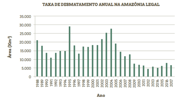 Entre 1990 e 2010, foram derrubados 55 milhões de hectares de floresta no Brasil. derrubados. Só na Amazônia, 780 mil km² de vegetação nativa já se perderam, uma área mais do que duas vezes maior que o território da Alemanha. O ritmo da destruição, nas últimas duas décadas, foi 170 vezes mais rápido do que aquele registrado na Mata Atlântica durante o Brasil-Colônia. A perda foi acelerada entre 1990 e 2000, com em média 18,6 mil km² desmatados por ano, e entre 2000 e 2010, com 19,1 mil km² perdidos anualmente e 6 mil km² entre 2012 e 2017. De acordo com o Sistema de Alerta de Desmatamento (SAD), em 2019, a Amazônia perdeu 6.200 km² de vegetação, um aumento de 16% em comparação com o total desmatado em 2018.